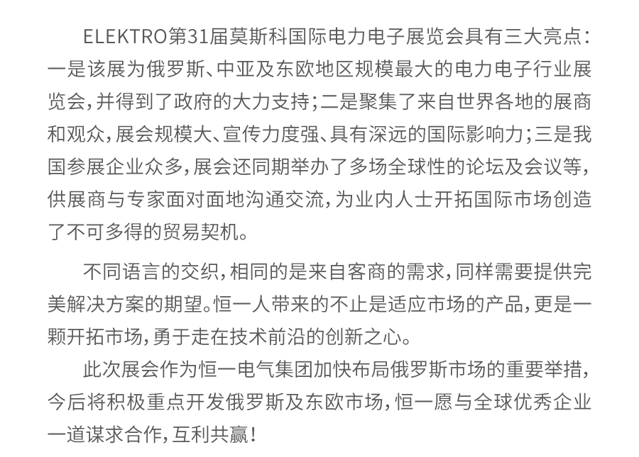 恒一携电能质量新品亮相 第31届俄罗斯国际电力电子展览会 (Elektro)